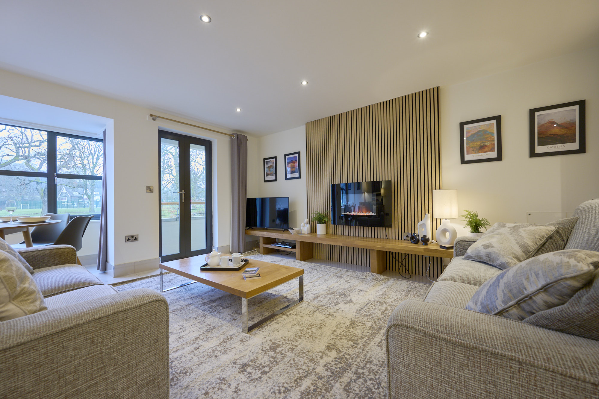 This ground floor apartment, has a lovely kitchen / dining / living space with a balcony overlooking the River Greta. An array of photography and art adorns the walls, in the interior designed space.