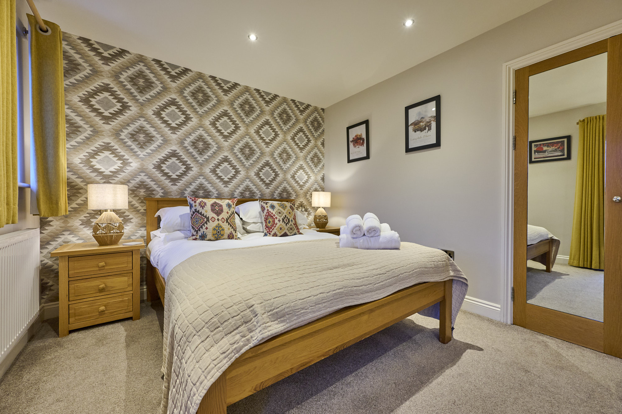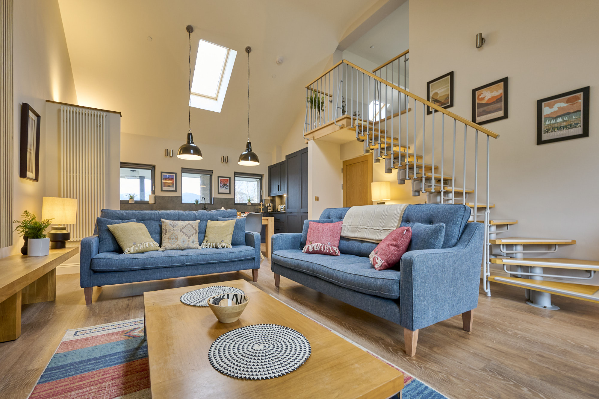 This second floor apartment, has stunning full height windows in the open plan kitchen / living area. The bright, modern kitchen has a full range of appliances as well as plenty of storage and worktop space to help you create your holiday meals. There is a small balcony overlooking the river. Apartment 5 benefits from two living areas, one on the main floor with a generous corner sofa in front of a wall-mounted electric fire and smart TV, the other, a peaceful spot upstairs in a mezzanine area. The master bedroom with kingsize bed, has a small balcony overlooking the river and has plenty of storage as well as an ensuite shower room. The second kingsize bedroom looks out over Keswick and has an adjacent bathroom with bath and shower over. There is a handy area at the entrance for coats and outdoor shoes. The apartment has its own named space for one car.